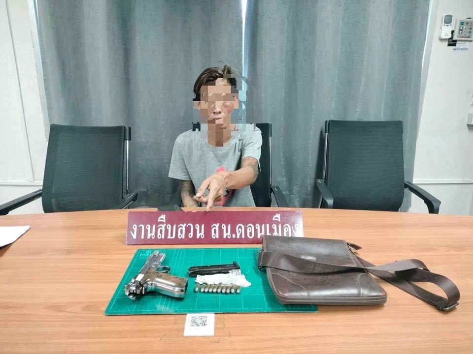 โดยในวันที่วันที่ 9 พฤษภาคม 2566 เวลาประมาณ 07.00 น. เจ้าหน้าที่ฝ่ายสืบสวนได้นำกำลังเข้าตรวจค้นหลังดังกล่าว เพื่อตรวจหาสิ่งของผิดกฎหมายตามข้อเท็จจริงที่ได้ทำการสืบสวน เมื่อไปถึงพบ นายภาคภูมิ หรือเป้ อ่อนสร้อย ผู้ต้องหา อาศัยอยู่ภายในบ้านกับลูกและภรรยา เจ้าหน้าที่ตำรวจจึงแสดงหมายค้นและเหตุแห่งการค้นให้ นายภาคภูมิ หรือเป้ฯ ดูจนเป็นที่พอใจและเข้าใจแล้ว จึงได้เข้าทำการตรวจค้นบ้านหลังดังกล่าว ผลการตรวจค้นพบอาวุธปืนไทยประดิษฐ์ แบบกึ่งอัตโนมัติ ขนาด .380 จำนวน 1 กระบอก พร้อมแมกกาซีน 1 อัน และเครื่องกระสุนขนาด .380 จำนวน 10 นัด ซุกซ่อนอยู่ในกระเป๋าสะพายข้างสีน้ำตาล ซึ่งแขวนไว้บนผนังภายในห้องนอนที่นายภาคภูมิ หรือเป้ฯ นอนอยู่ในขณะนั้น ซึ่งนายภาคภูมิ หรือเป้ฯ ให้รับการรับว่าปืนกระบอกดังกล่าวเป็นของตนจริง ไม่มีหลักฐานใดประกอบมากับปืนเลย ซึ่งทำการซื้อมาจากแอพพลิเคชั่นเฟซบุค จากมีเพจที่ใช้ชื่อว่า “ปืนเถื่อน” โดยซื้อมาในราคา 14,500 บาท เมื่อโอนเงินแล้วทางเพจจึงจะทำการจัดส่งอาวุธปืนพร้อมเครื่องกระสุนมาให้ผู้ซื้อทางพัสดุ เจ้าหน้าที่ฝ่ายสืบสวน จึงได้ทำการตรวจยึดของกลางดังกล่าวพร้อมแจ้งข้อกล่าวหาให้ผู้ต้องหาทราบว่าถูกจับในข้อหา “มีอาวุธปืนและเครื่องกระสุนปืนไว้ในครอบครองโดยไม่ได้รับอนุญาต” และได้แจ้งสิทธิที่ถูกต้องตามกฎหมายให้ผู้ต้องหาจนผู้ต้องหาทราบและเข้าใจดีแล้ว จากนั้นเจ้าหน้าทำฝ่ายสืบสวนจึงได้ควบคุมตัวผู้ต้องหาให้พนักงานสอบสวน สน.ดอนเมืองดำเนินการตามกฎหมายต่อไป-จากการตรวจสอบประวัติข้อมูลคดีอาญาของ ภาคภูมิ อ่อนสร้อย ผู้ต้องหา ปรากฏรายละเอียดดังนี้