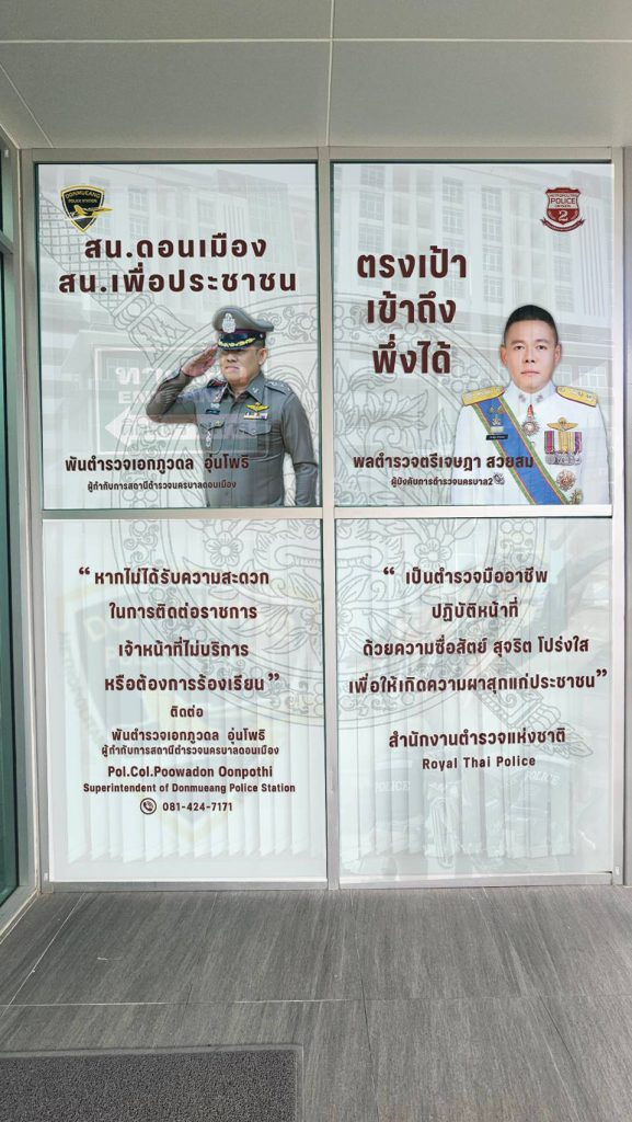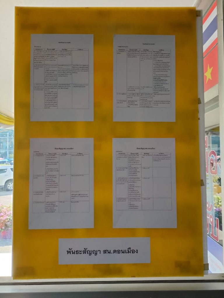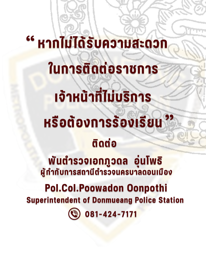 ติดไว้ในจุด บริการของสถานี เพื่อให้ประชาชนทราบว่า หน่วยงานประกาศว่าเจ้าหน้าที่ทุกคนในสังกัดไม่รับของขวัญหรือของกำนัลจากการปฏิบัติหน้าที่ และต่อต้านการรับสินบน โดย มี พ.ต.อ.สุกฤต มังคละสวัสดิ์ ผกก.สน.ดอนเมือง หัวหน้าหน่วยงานประกาศ
